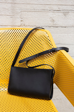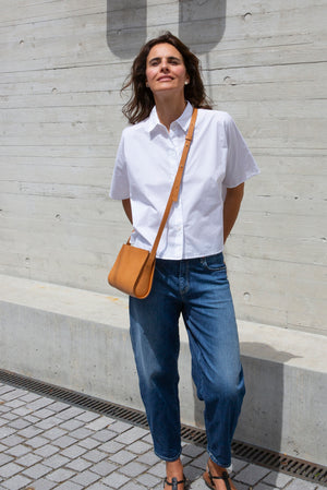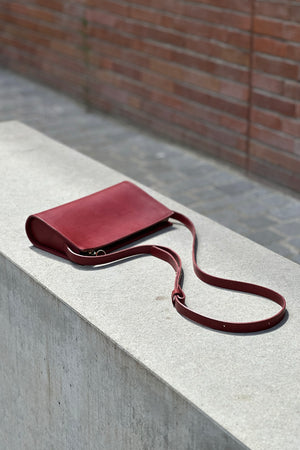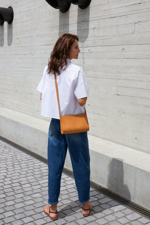 Teardrop-shaped crossbody bag handcrafted from vegetable-tanned leather, featuring a top zipper closure and an adjustable strap. The interior includes slip pockets for essentials like phone, cards, and bills, offering practical organization. A classic design that blends modern minimalism with practical utility.