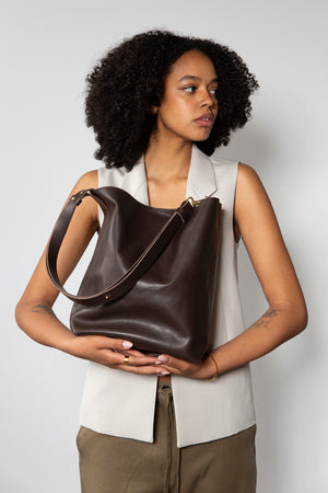 The Brass Link Porter features a generous main compartment with a secure zippered pocket and a wide slip pocket for easy access to essentials. The adjustable shoulder strap offers two settings for shoulder or crossbody wear. A solid brass swivel hook adds a distinctive touch to this everyday companion. Upper closure: Magnetic snap button.