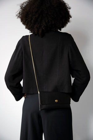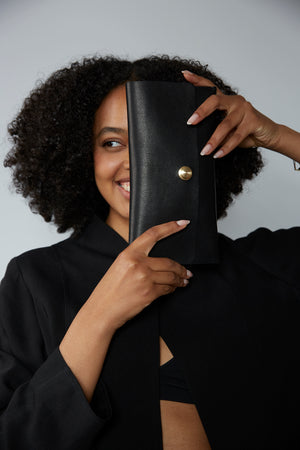 A sleek leather clutch with bold chain strap and sophisticated brass button-lock. The interior is fully leather-lined and includes a single slip pocket for small items.