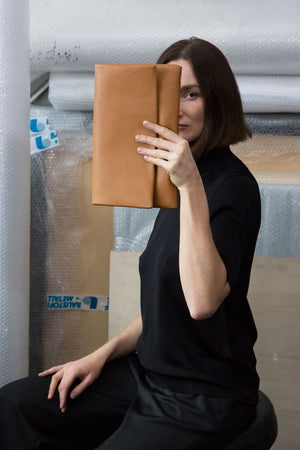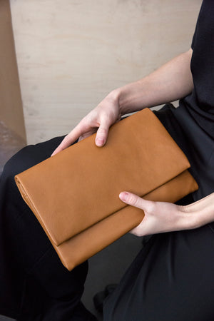 Clutch, handcrafted from soft eco nappa leather, lined with suede. Magnetic snap closure; interior zipper pocket.