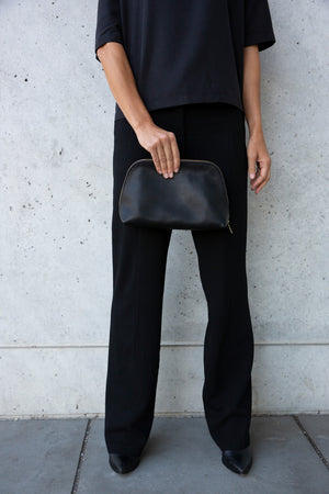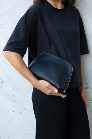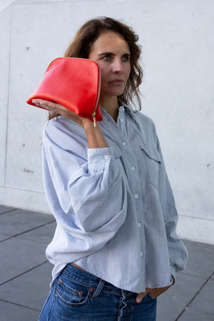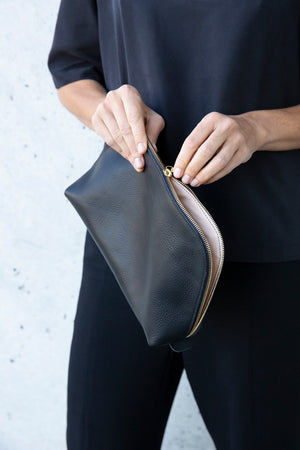 Die Zippered Cloud ist eine geräumige Clutch mit einem Innenleben aus nude-farbenem Leder. Goldfarbener Metallreißverschluss, Innentasche aus Leder. Handgefertigt in München.