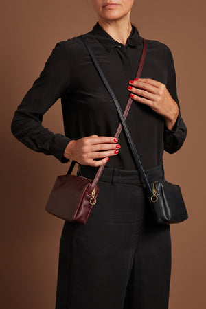 Schulter- / Umhängetasche, handgefertigt aus Öko-Nappaleder, gefüttert mit Bio-Baumwoll-Canvas. Reißverschluss, Innenfach, dünner Lederriemen.