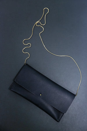 Clutch / Umhängetasche, handgefertigt aus Öko-Nappaleder mit abnehmbarer Kette. Mit Leder gefüttert. Innentasche aus Leder für das Telefon. Verschluss: massiver Messingknopf.