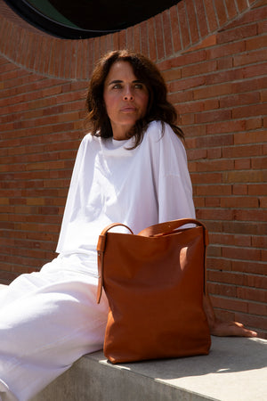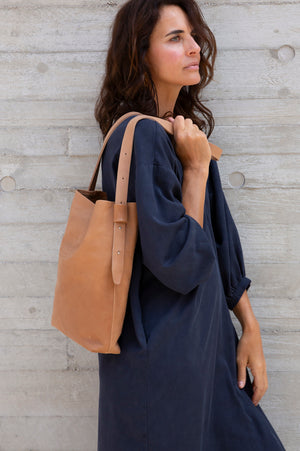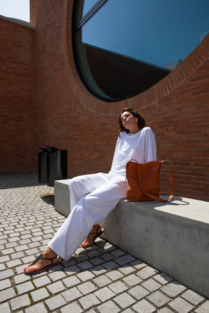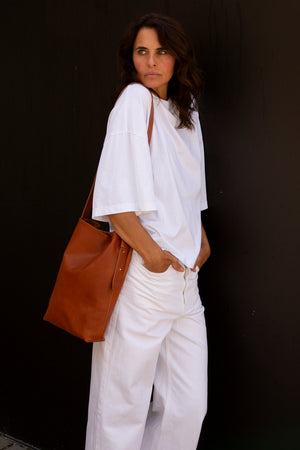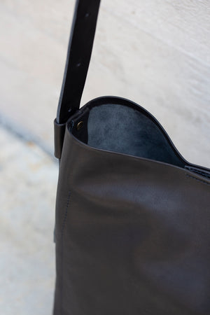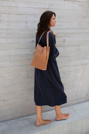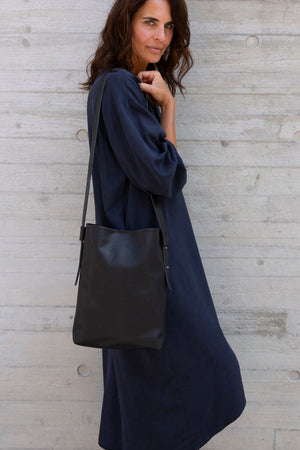 Eine mittelgroße Tasche, die ausreichend Platz für alles bietet, was man im Alltag benötigt. Handgefertigt aus zertifiziertem Ökoleder, mit einem nahtlosen Taschenrand und zwei schlichten Schlaufen, die den verstellbaren Riemen halten. Der Riemen kann beidseitig verstellt werden. Innen komplett aus Leder gearbeitet, mit großem Steckfach und Handyfach.